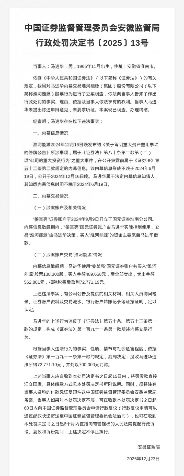 2025-12-23《中国证券监督管理委员会安徽监管局行政处罚决定书〔2025〕13号》(马进华案)