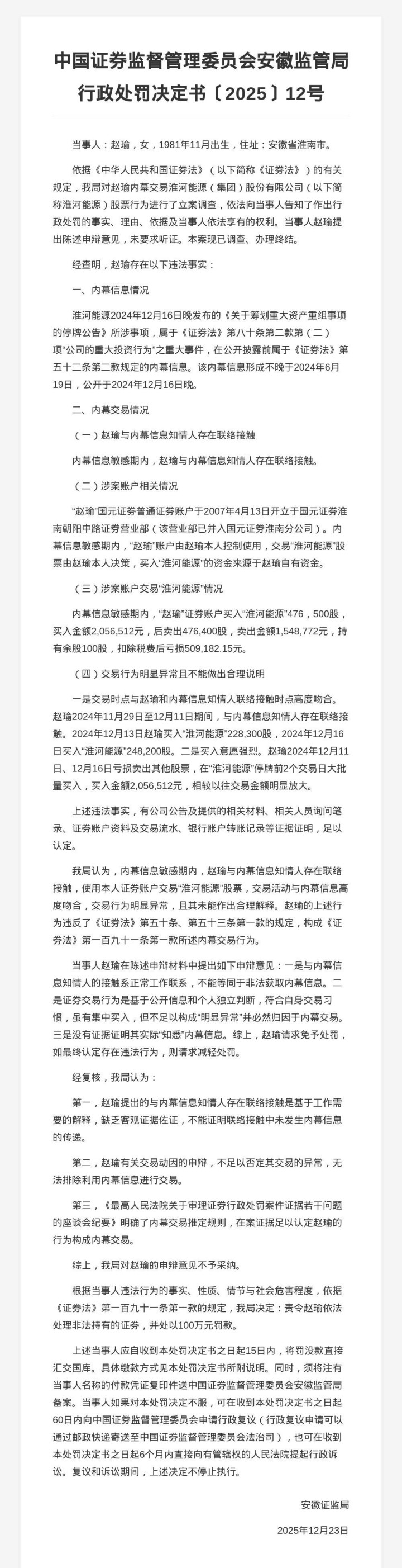 参考资料: 2025-12-23《中国证券监督管理委员会安徽监管局行政处罚决定书〔2025〕12号》(赵瑜案)
